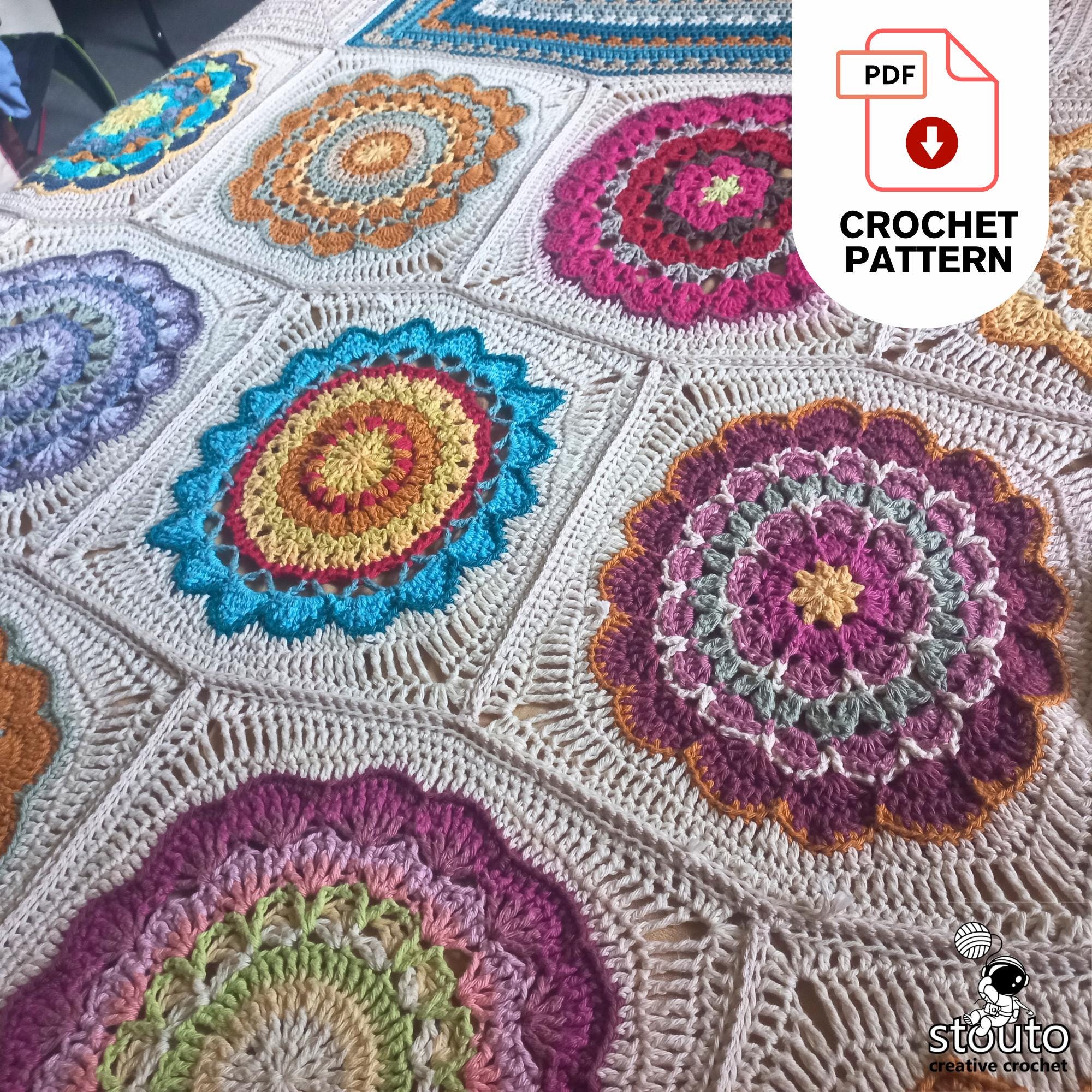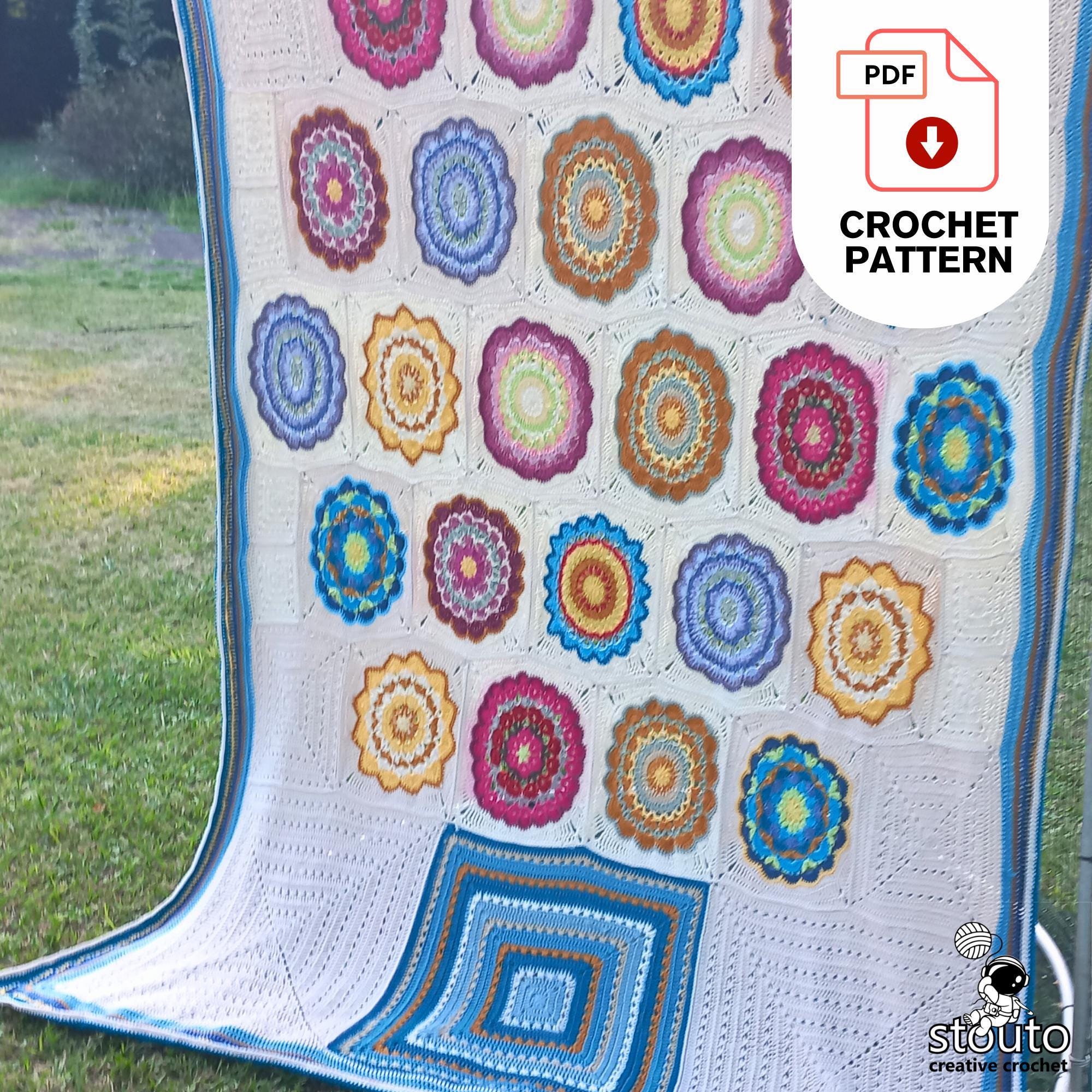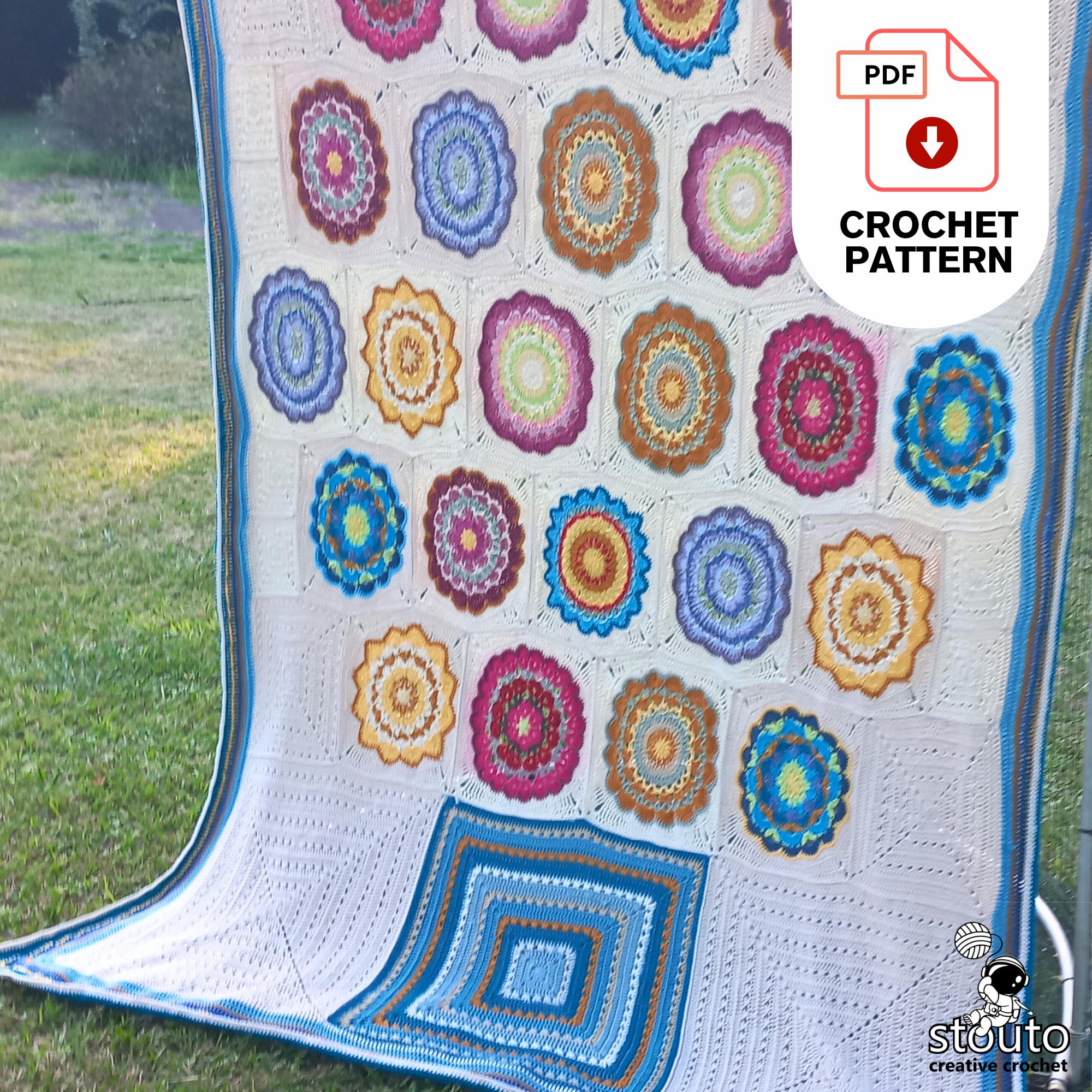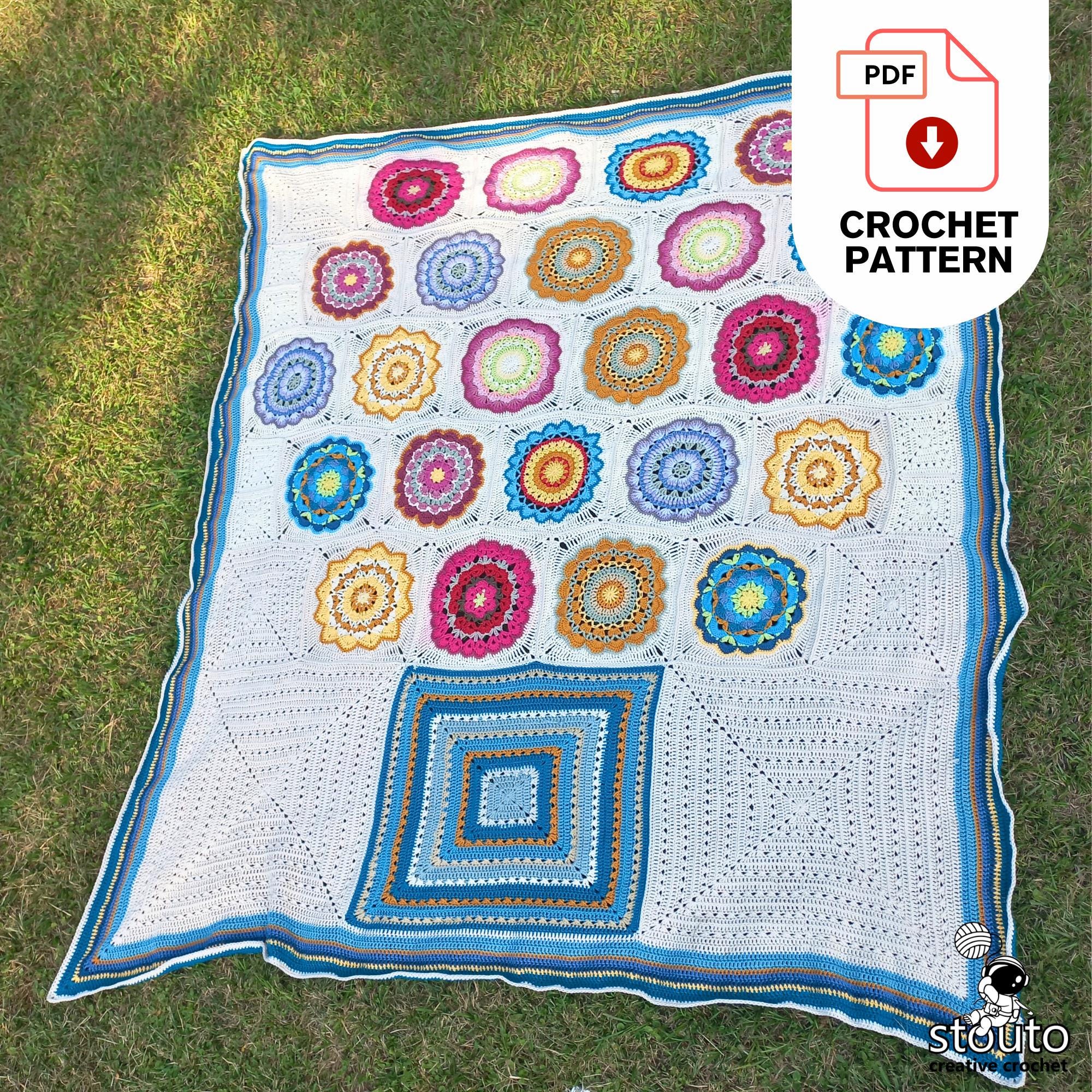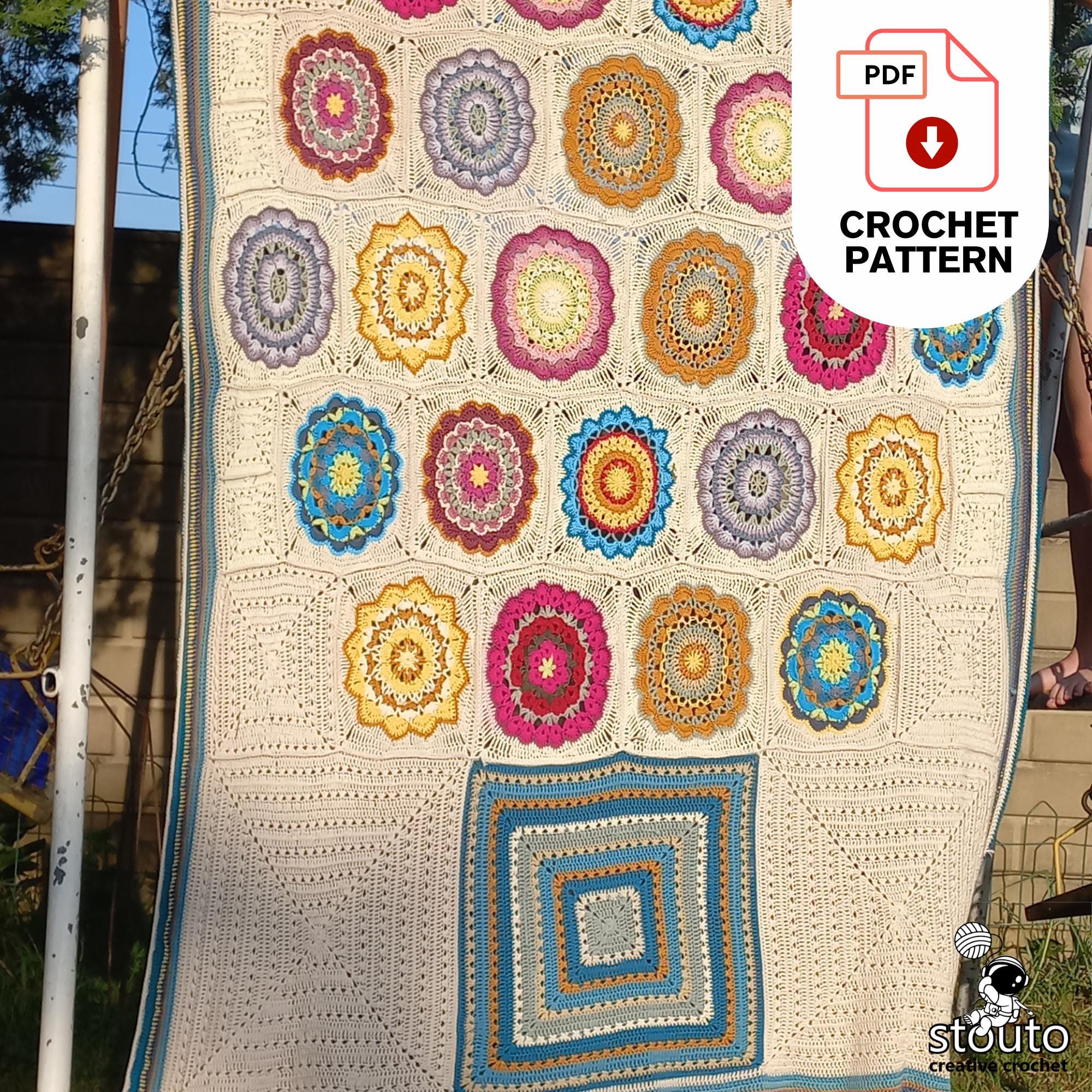 The pattern includes 12 different square designs, each with easy-to-follow written instructions and row-by-row photo tutorials to guide you through the process. Squares are crocheted individually and then joined together to form a large decorative blanket.